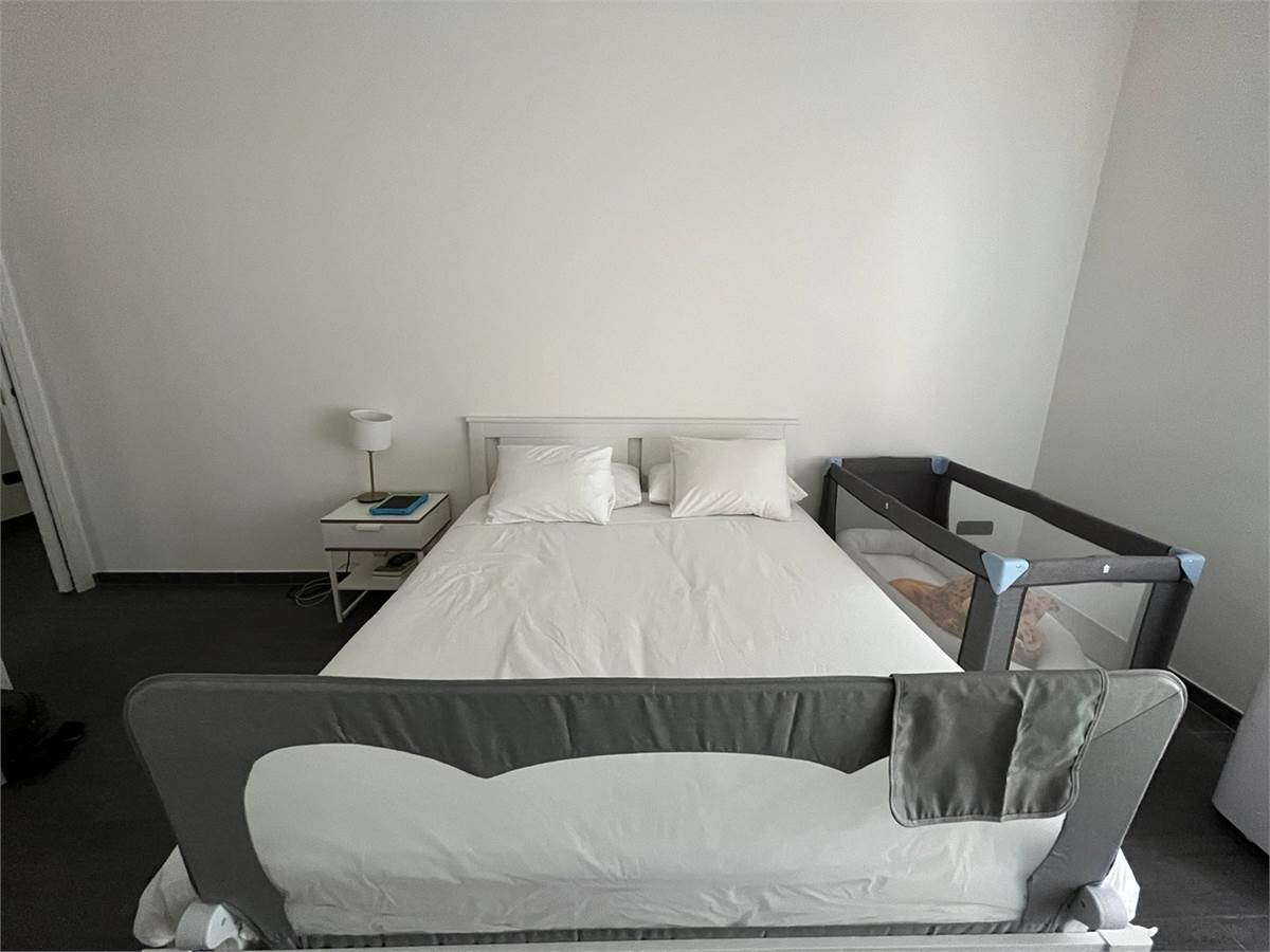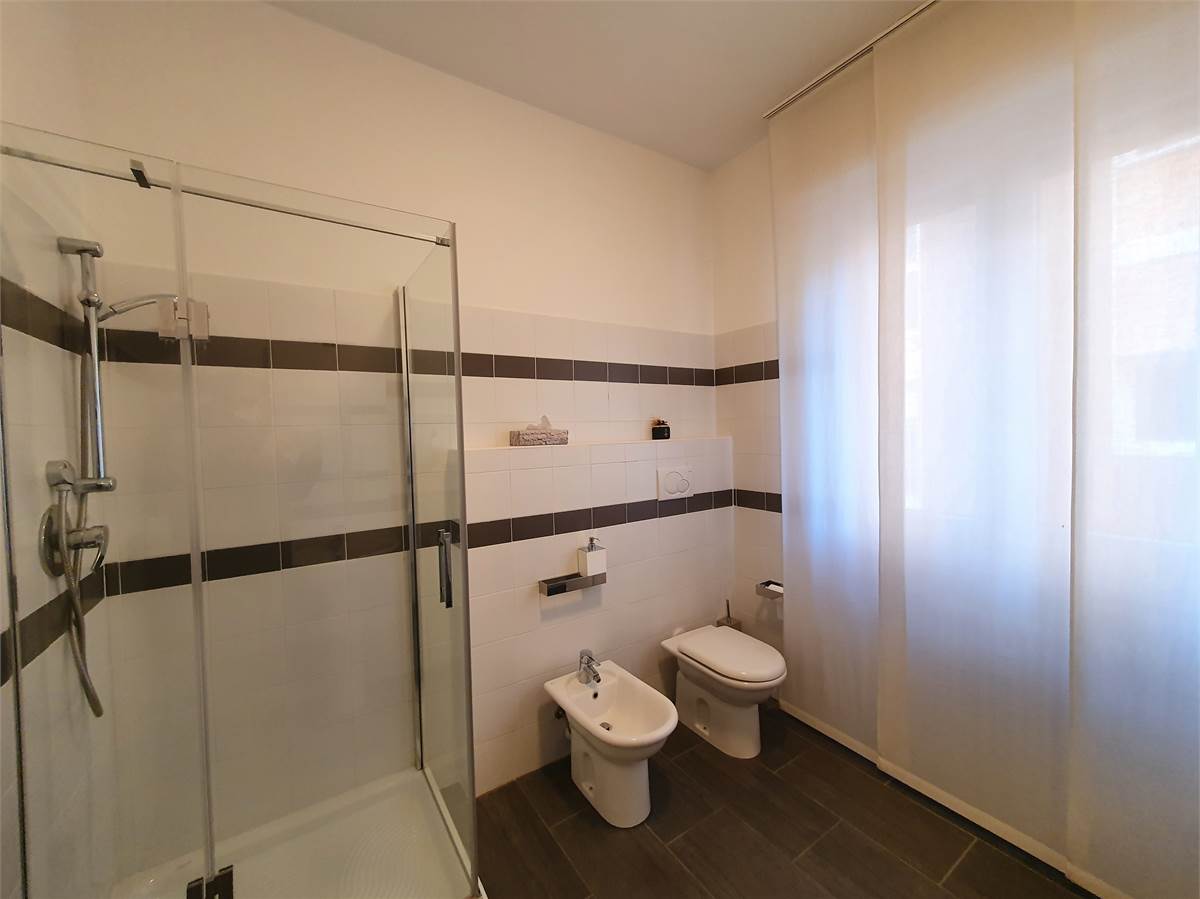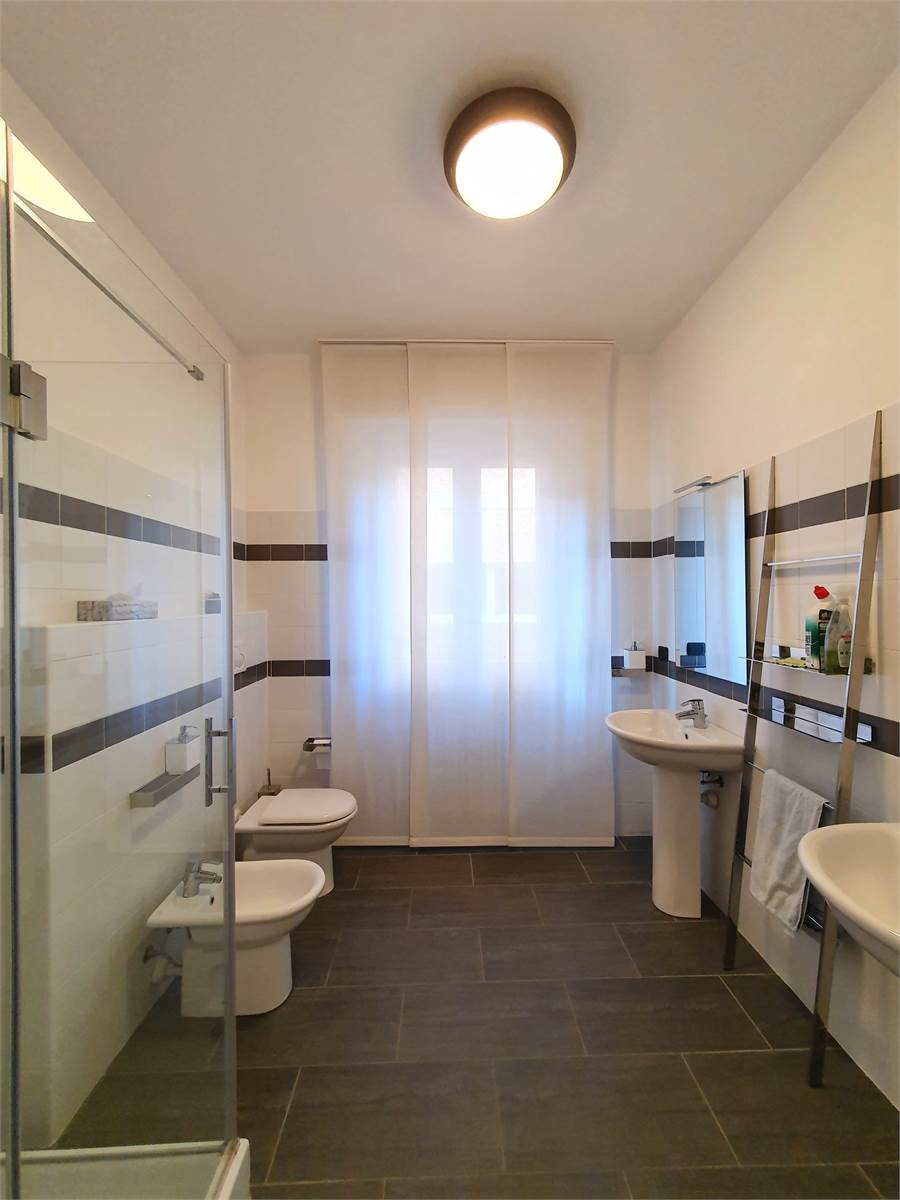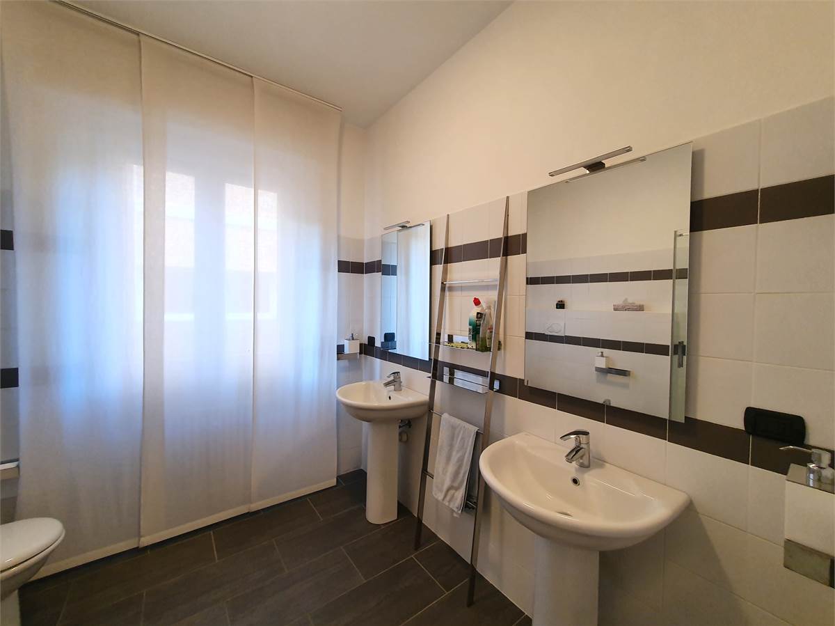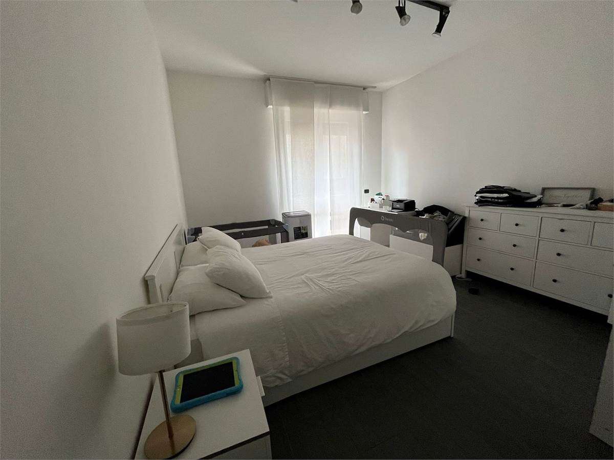 La zona notte comprende due spaziose camere matrimoniali, di cui una attualmente arredata con divano letto, e un bagno elegante con doppio lavabo. Completa la proprietà una comoda cantina.