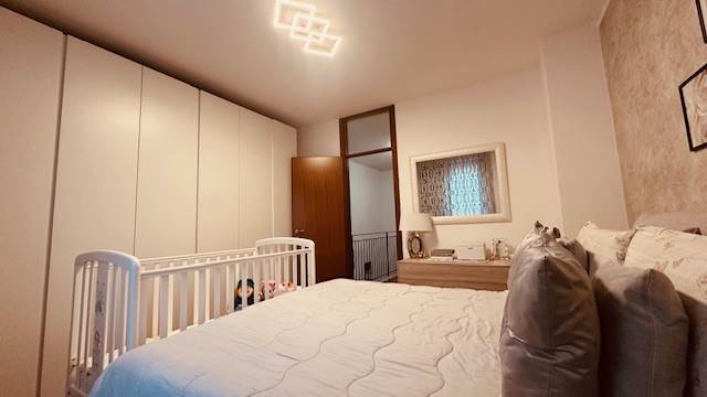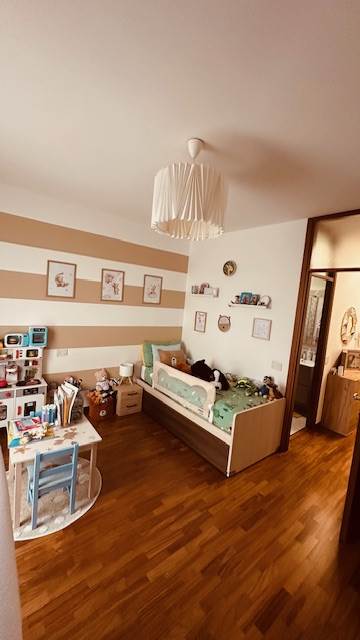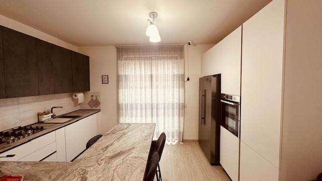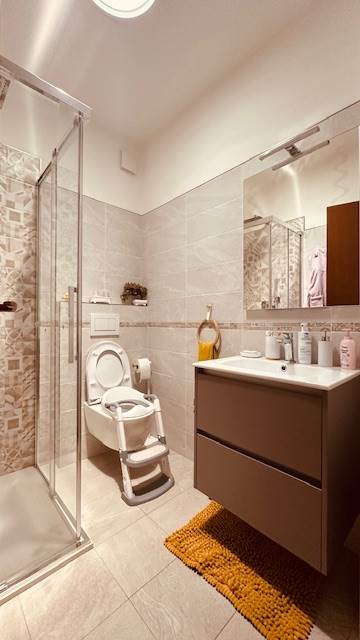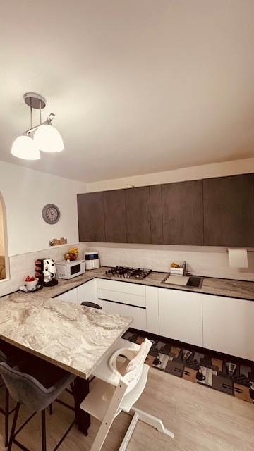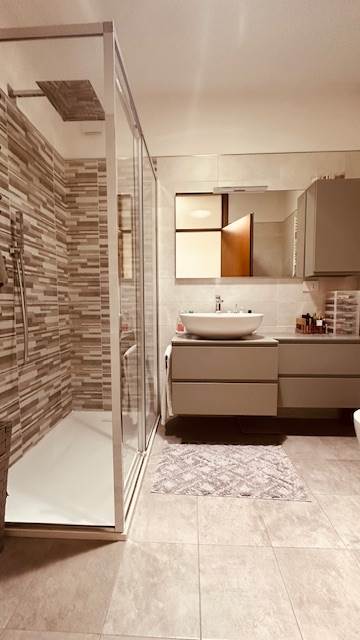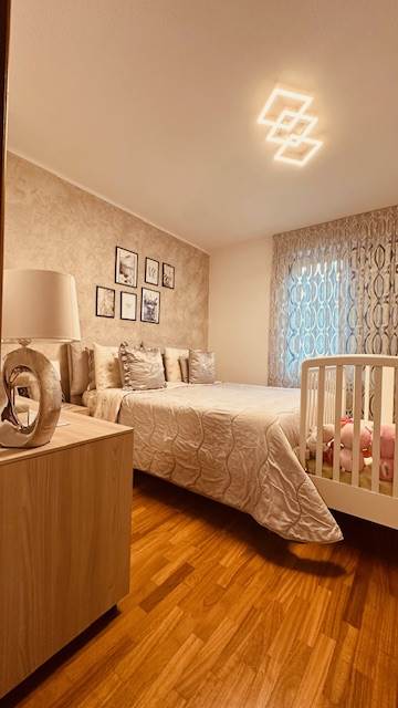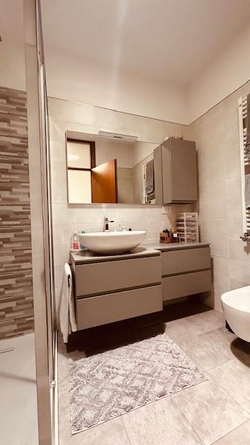 Dispone di una cucina abitabile molto bella, disegnata su misura, la quale potrebbe essere lasciata (con una trattativa) all'interno dell'immobile. Nella zona notte, troviamo due camere molto generose, camere doppie con balcone, addirittura un doppio servizio, i quali sono stati ristrutturati a nuovo.