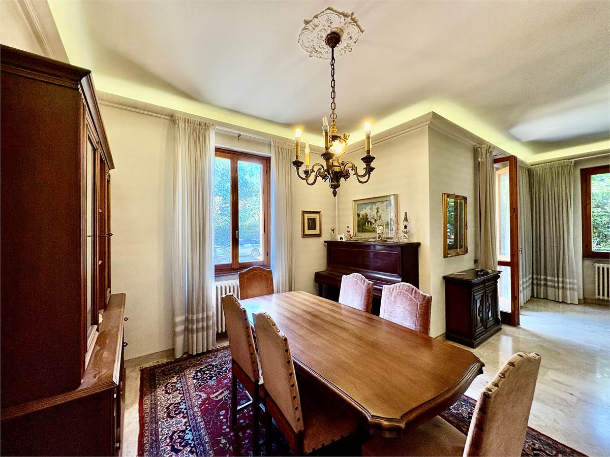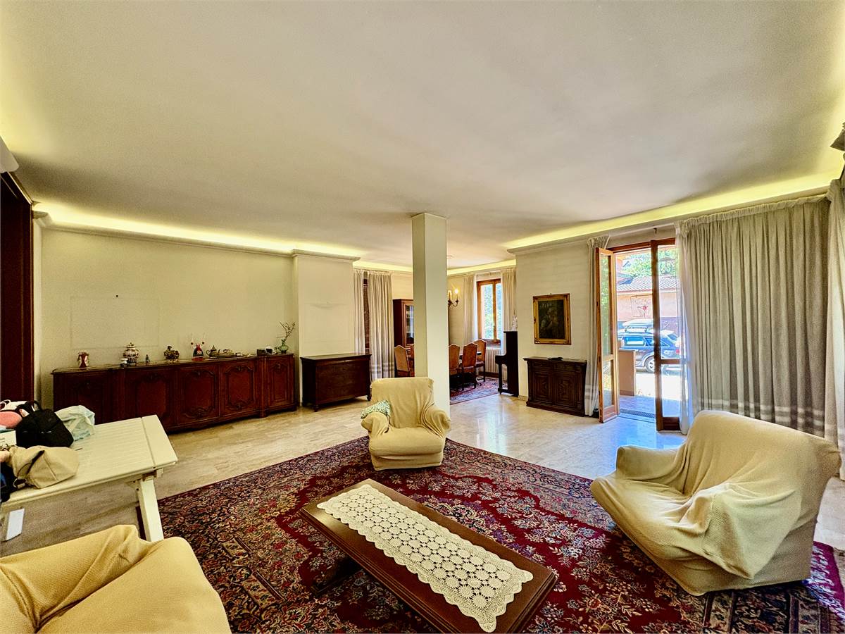 La villa è composta al piano terra da un ampio salone doppio con soggiorno, tinello con camino e accesso alla torretta, uno studio, una camera, locale multiuso, la cucina abitabile con affaccio sul giardino, il bagno