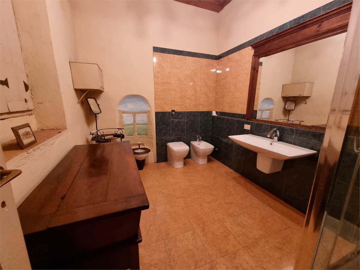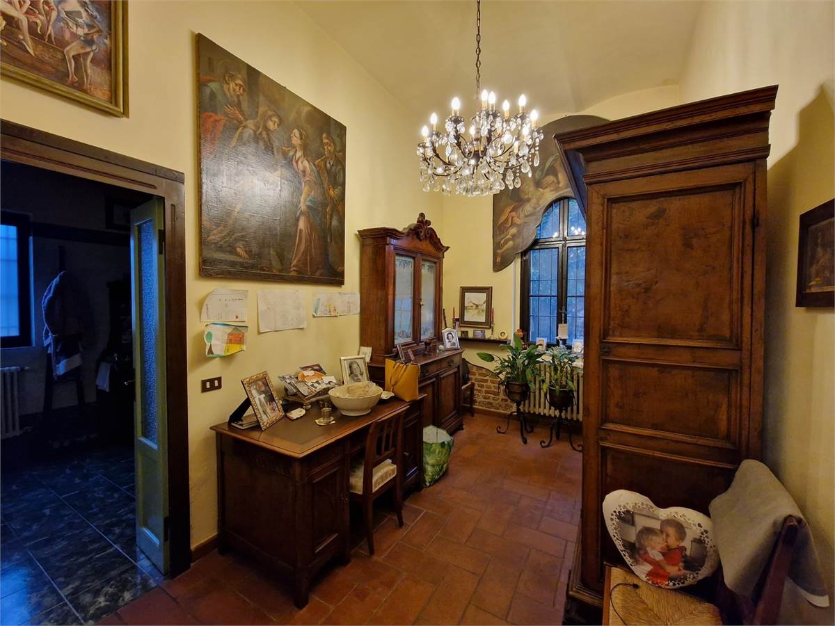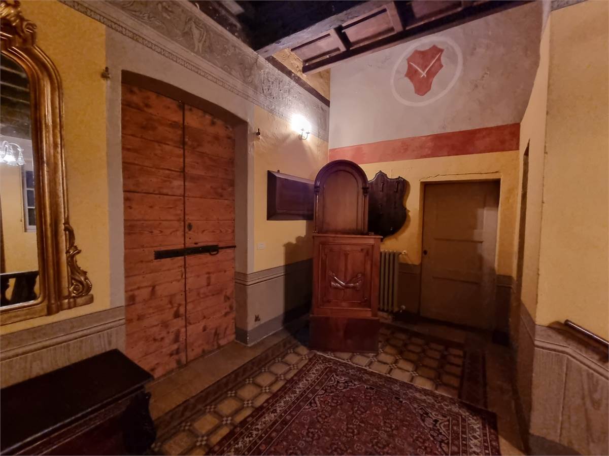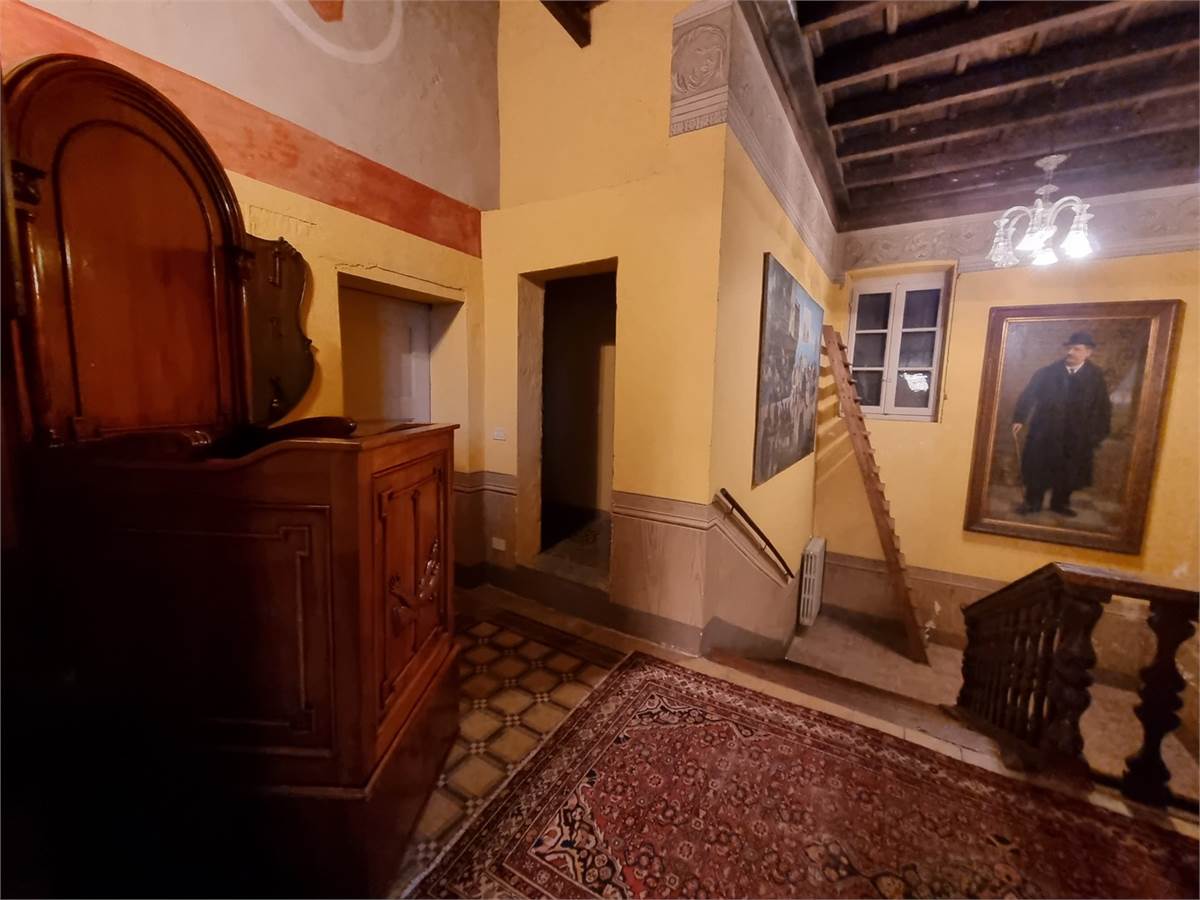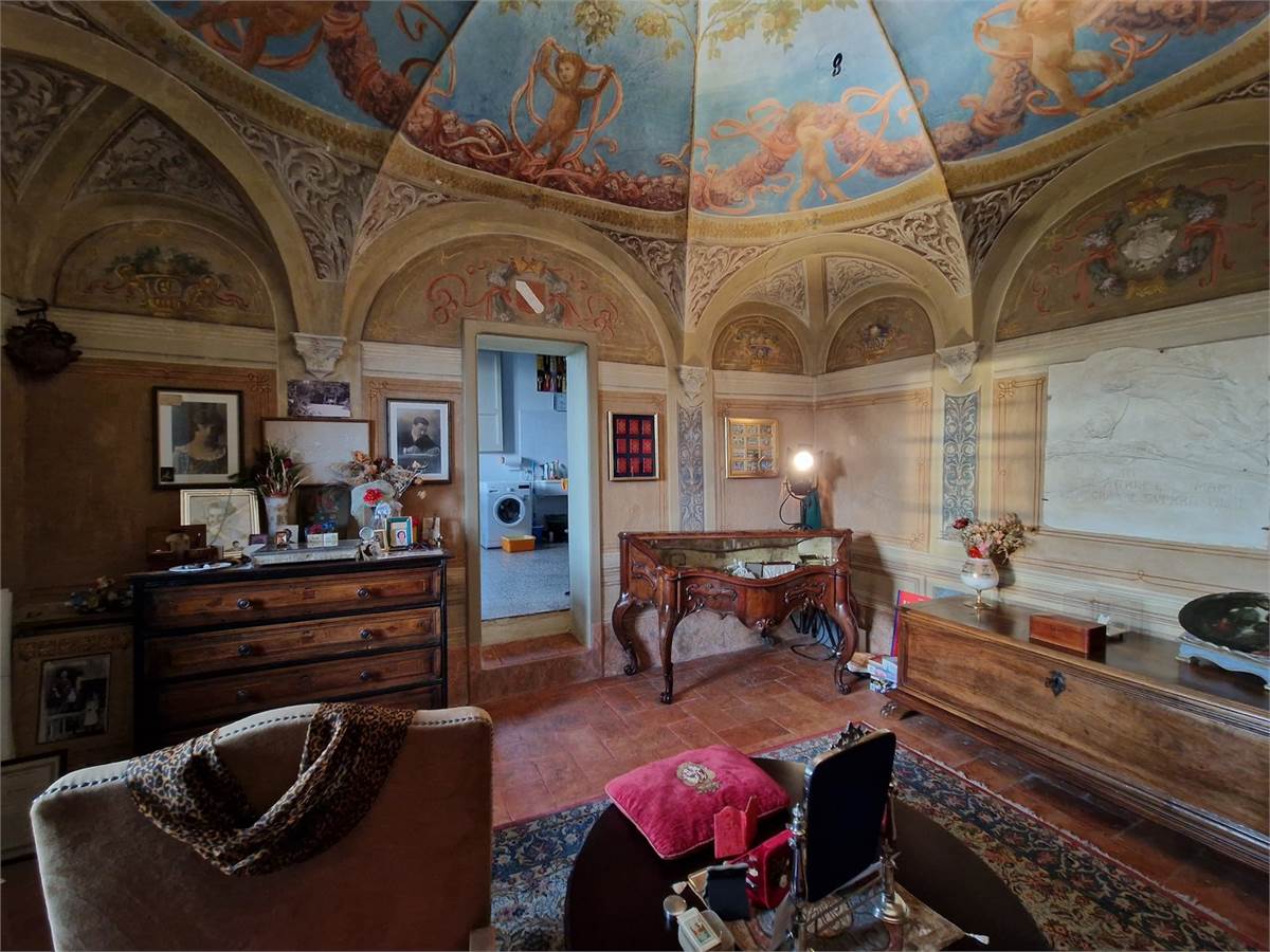 Piano terra: porticato di ingresso su ampio soggiorno corredato di tavolone fratino, locale studio che affaccia sul verde circostante, cucina abitabile comunicante tramite pertugio col piano primo, disimpegno, servizio igienico con ampie vasca e box doccia, camera da letto matrimoniale con bifore, sala lettura con soffitto a cupola affrescato ad “Angeli” e spaziosa lavanderia con annesso servizio.