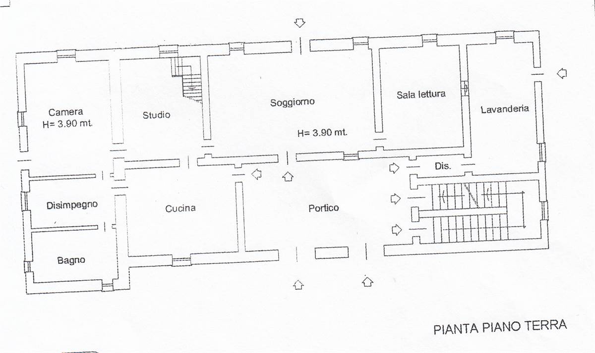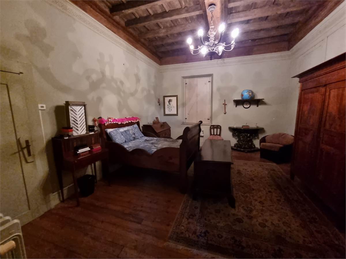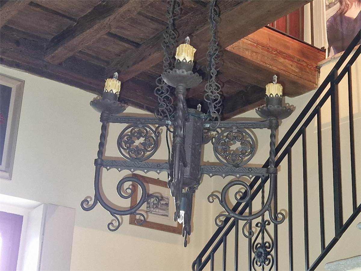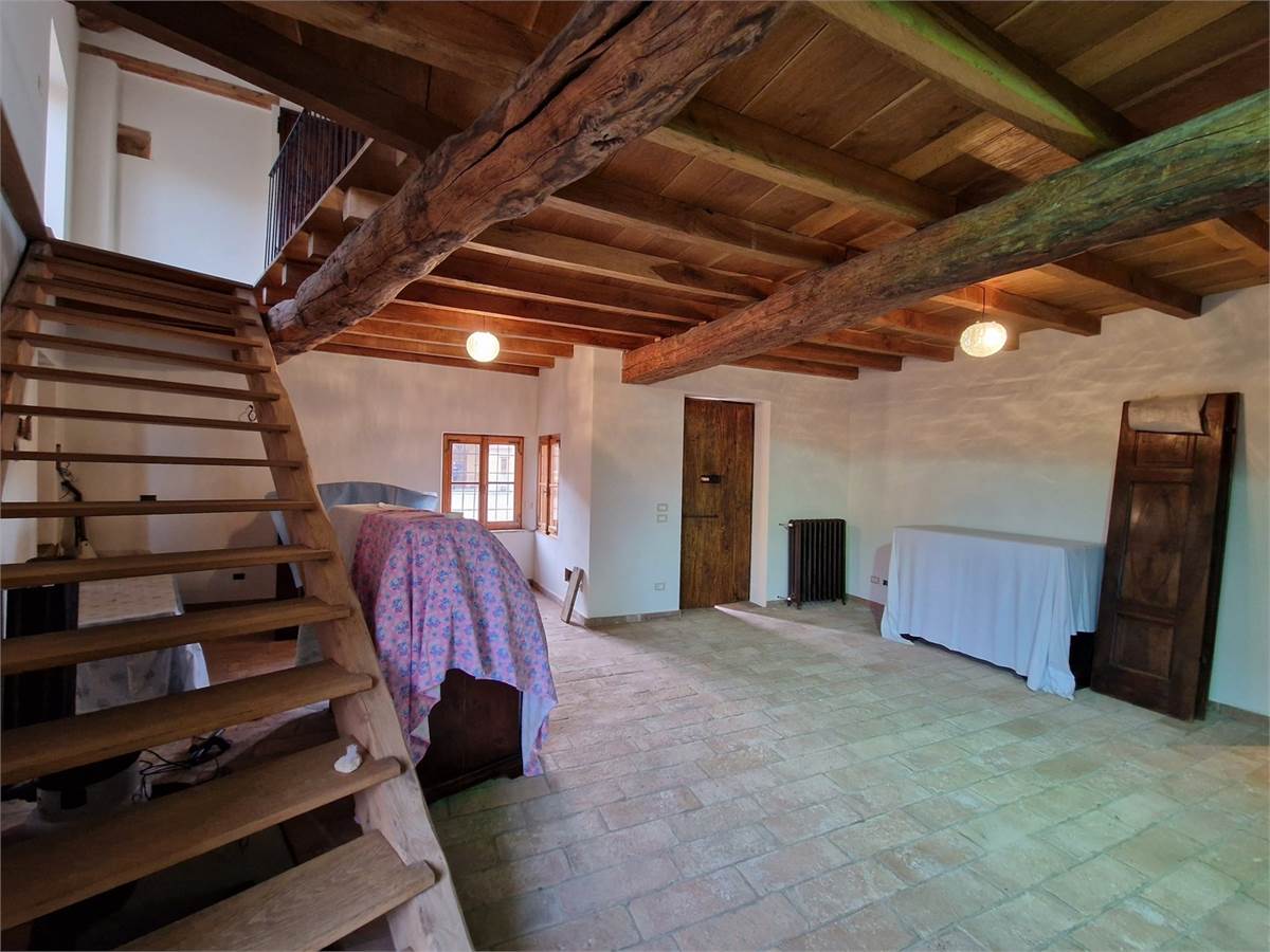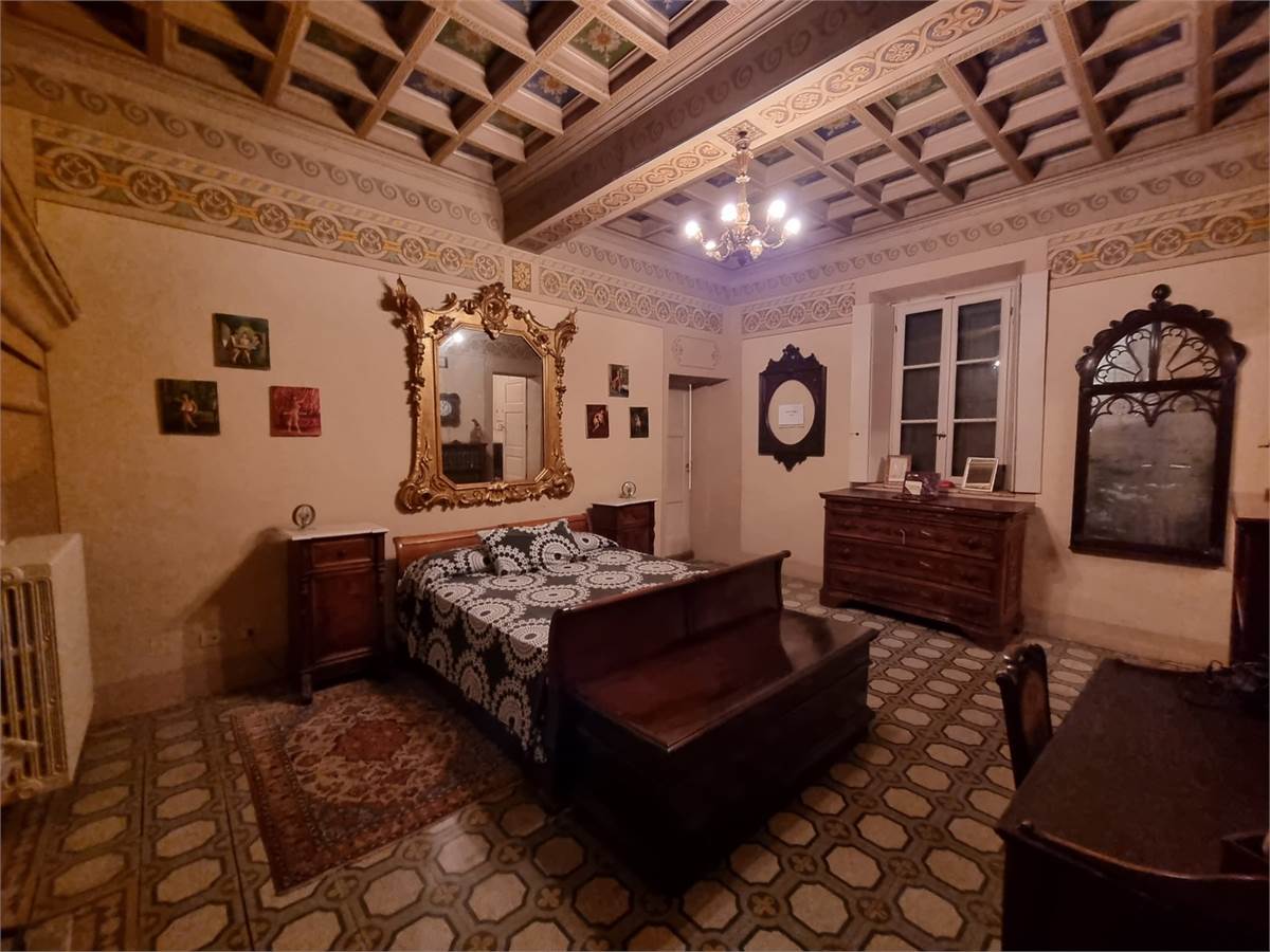 Piano terra: porticato di ingresso su ampio soggiorno corredato di tavolone fratino, locale studio che affaccia sul verde circostante, cucina abitabile comunicante tramite pertugio col piano primo, disimpegno, servizio igienico con ampie vasca e box doccia, camera da letto matrimoniale con bifore, sala lettura con soffitto a cupola affrescato ad “Angeli” e spaziosa lavanderia con annesso servizio.