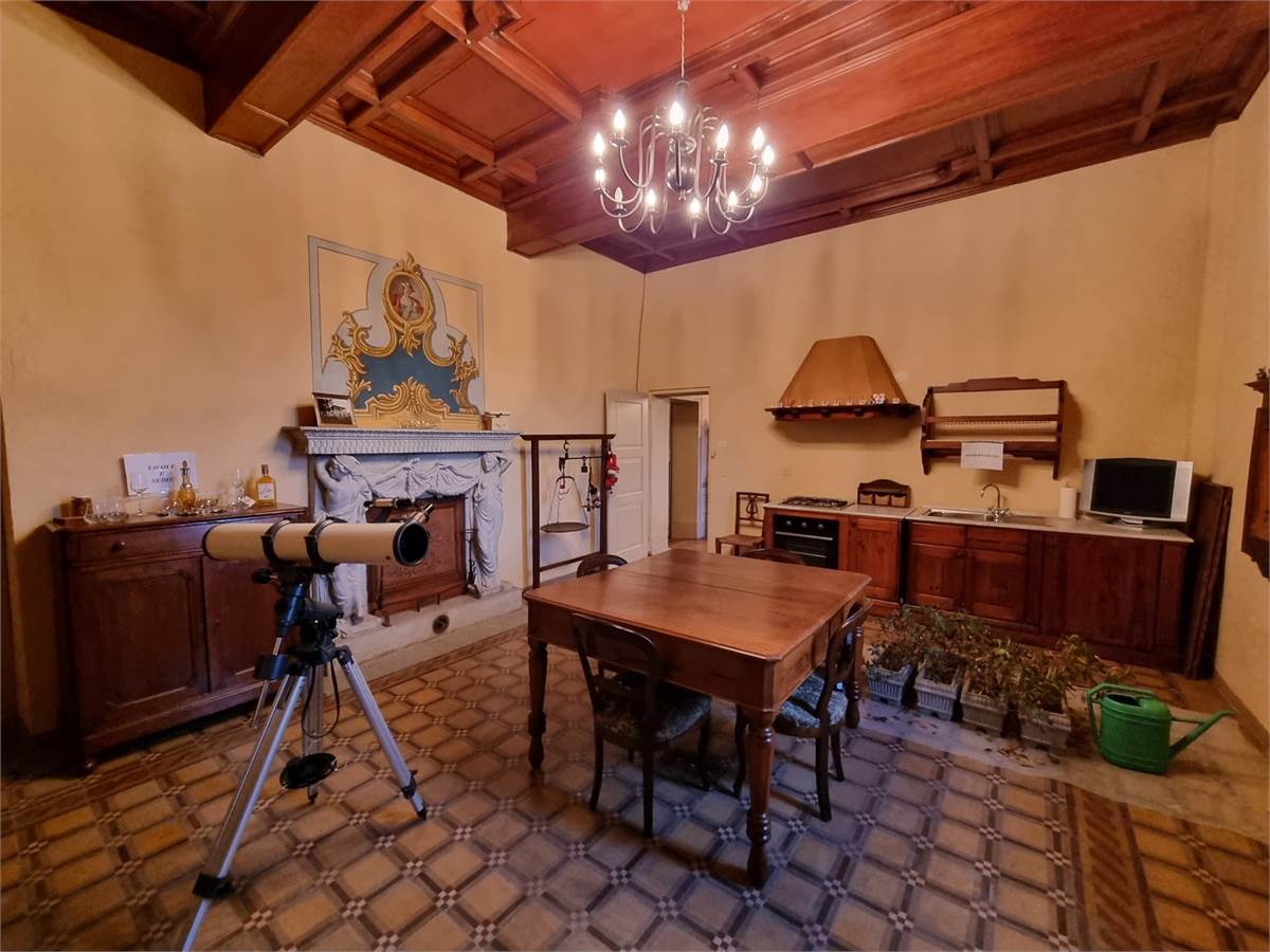 Piano primo: due camere da letto con due servizi igienici, locale studio, ampio soggiorno con coppia di importanti lampadari, stanza degli armadi seicenteschi e cucina che esce in uno spettacolare terrazzo di circa 50 mq che offre la vista sull’intera tenuta.